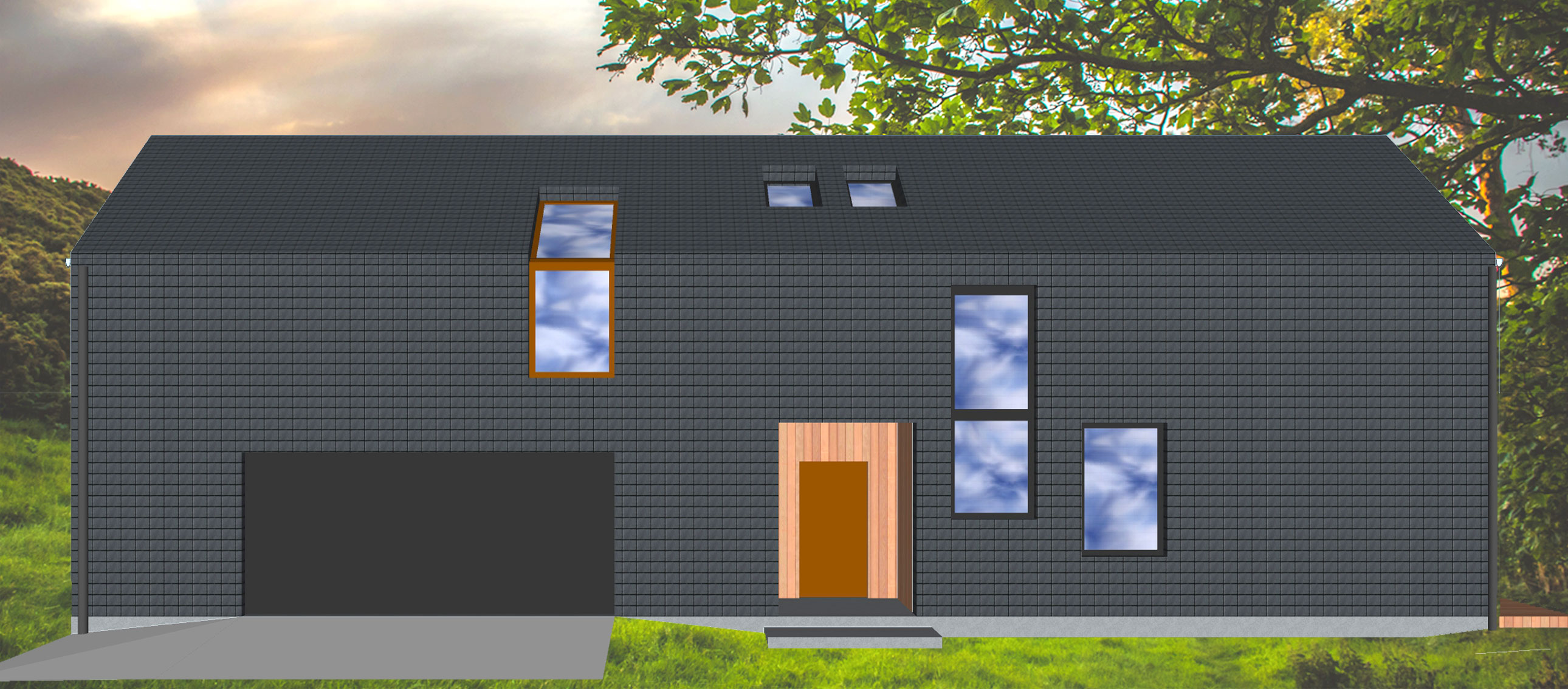 Dach – dwuspadowy, nachylenie 30°, więźba drewniana, wykończenie łupek naturalny